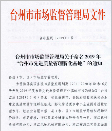 2019年8月19日,臺州市市場監(jiān)督管理局發(fā)布了臺市監(jiān)質(zhì)[2019]8號文件關于命名2019年“臺州市先進質(zhì)量管理孵化基地”的通知,我公司在2019年度臺州市級先進質(zhì)量管理孵化基地申報項目申報工作中,經(jīng)市場監(jiān)管局組織現(xiàn)場評價驗收,市局審核,同意命名為“臺州市先進質(zhì)量管理孵化基地”。