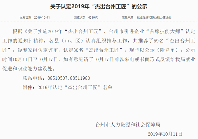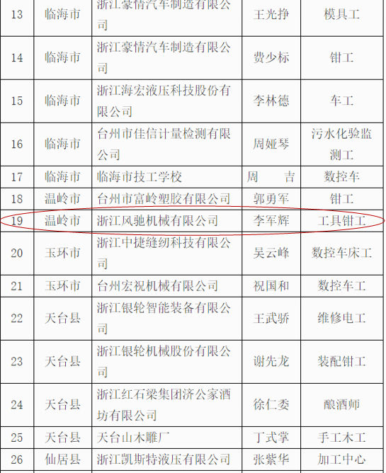 我司根據(jù)《關(guān)于實(shí)施2019年“杰出臺州工匠”、臺州市引進(jìn)企業(yè)“首席技能大師”認(rèn)定工作》的通知要求,通過公司推薦,資格初審,經(jīng)專家組認(rèn)定評審,我司研發(fā)中心工程師李軍輝成功順利入選被評選為“杰出臺州工匠”,并在網(wǎng)上予以公示,符合公司的價值觀“客戶為先、誠信負(fù)責(zé)、團(tuán)隊(duì)合作、務(wù)實(shí)創(chuàng)新”精神。