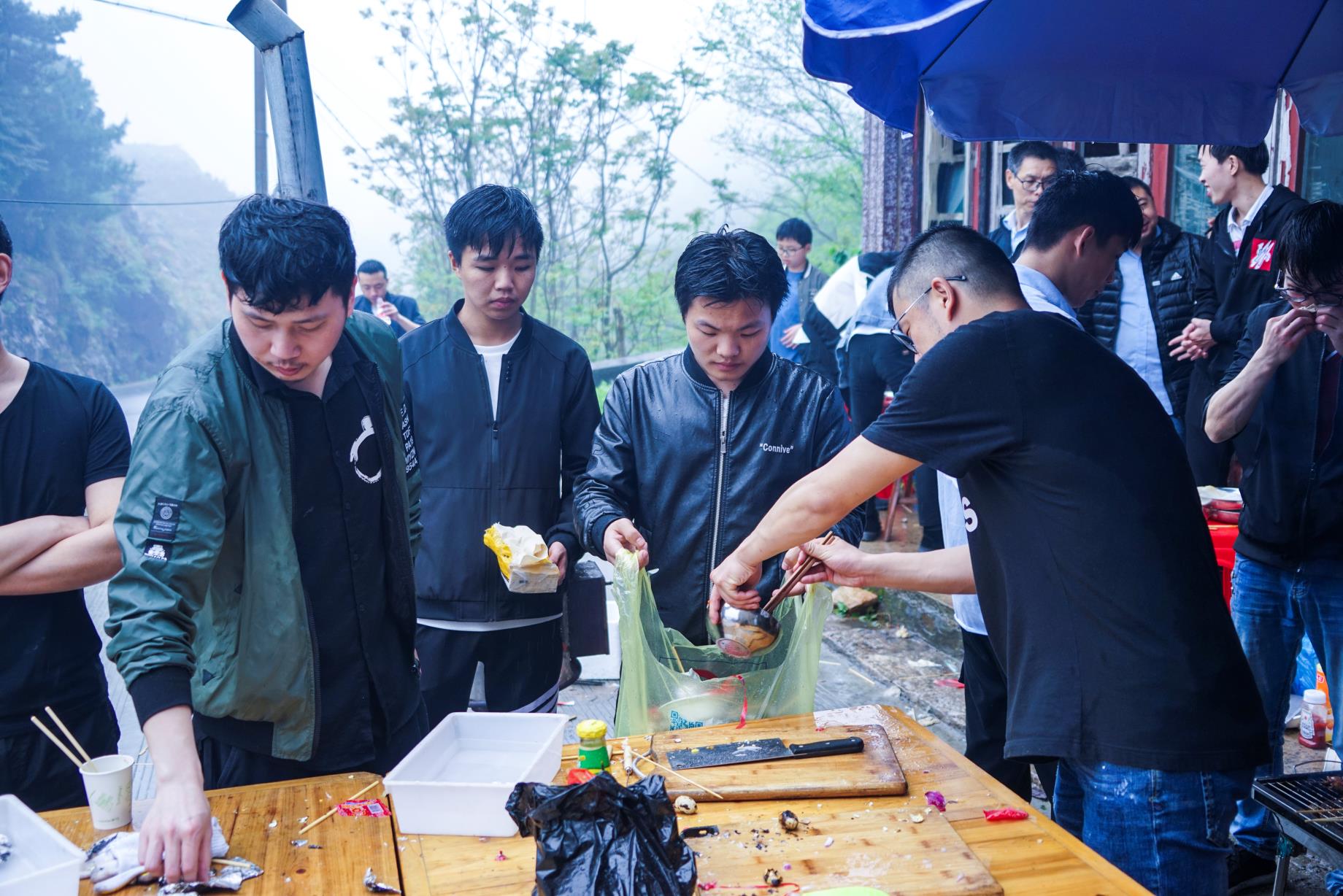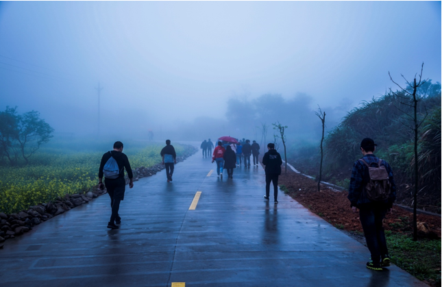在各組成員吃飽喝足充滿能量之后 ,開始了此次活動最高潮部分——暴走。在開始暴走之前,參加暴走的全體成員在自行車協(xié)會牌前集合進行了合影留念,之后開始了暴走活動。天氣依然是跟早上一樣,三米開外的地方,似乎什么都看不清了,天空中也下著蒙蒙細雨,但一點也不影響我們的心情。大家一邊歡快地聊著天,一邊向上地攀登者。享受著霧蒙蒙的風(fēng)景,在這詩情畫意中繼續(xù)著。很快我們從平坦的水泥路轉(zhuǎn)到了泥濘的山路中。疊翠的峰巒、茂密的森林和曲折盤旋的山路讓我們不禁陶醉其中,盡情領(lǐng)略大自然的風(fēng)情。各個部門之間都彼此相互鼓勵、相互協(xié)助,不斷挑戰(zhàn)著自己。