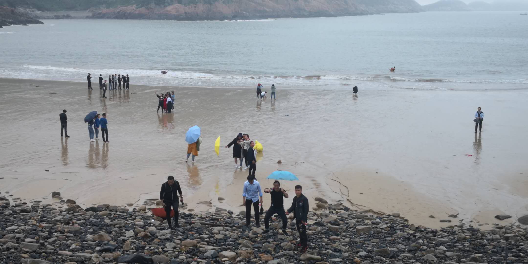 中轉(zhuǎn)站我們定在了大坑沙的沙灘上。這是一片幾乎被遺忘的原生態(tài)沙灘。沙灘的兩側(cè)是飽受海水侵蝕的礁石,形態(tài)各異。黑白相間的鵝軟石占據(jù)了這片沙灘。到時正趕上潮平似退未退時,在平坦結(jié)實的沙灘上走一走,迎面而來的潮水似進又退,不知不覺中也跟著他的步子,一步步走向大海,在潮水中嬉戲。不一會,天空下起了雨,似有留客的意思。